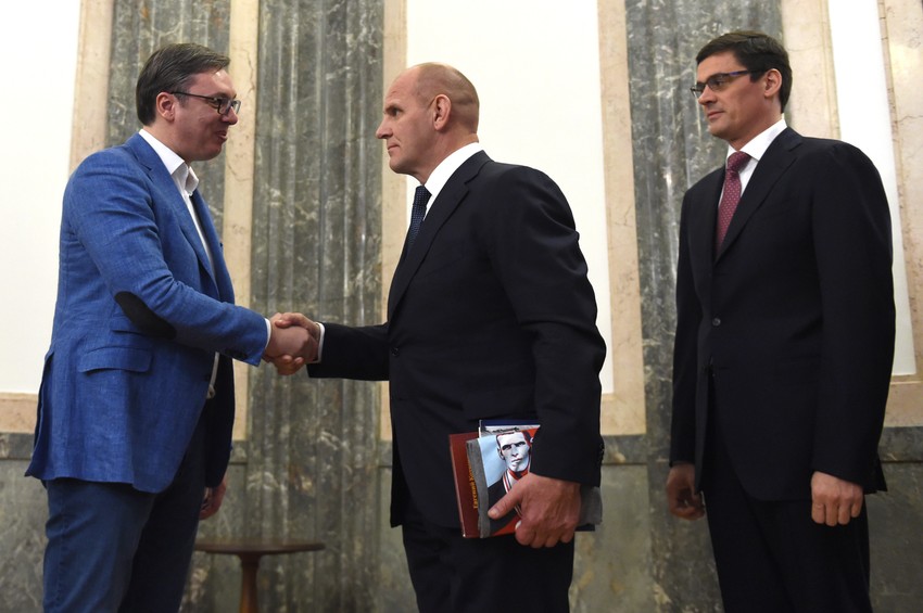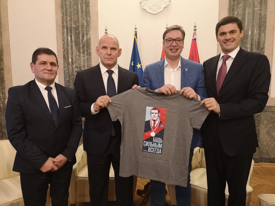 Vučić je na početku sastanka u Generalnom sekretarijatu predsednika Republike na Andrićevom vencu, naveo da poseta ruskih sportista predstavlja veliku čast za njega. Naveo je da su Kareljin i Popov verovatno među deset najboljih sportista svih vremena na svetu, i dodao da je Kareljin samo u dva meča bio poražen i to greškom, a da je u 800 mečeva pobedio, dok je Popov u Atlanti i Barseloni osvojio mnogo medalja.