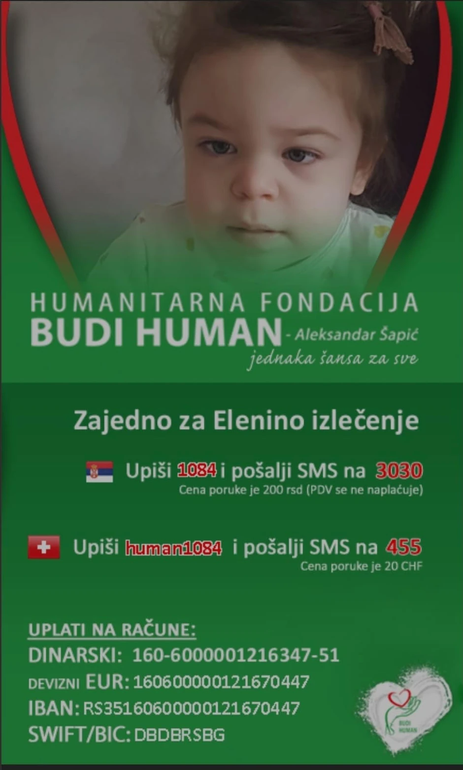 Eleni možete pomoći slanjem sms poruke 1084 na 3030 ili uplatom na žiro račun fondacije Budi human na neki od žiro računa: