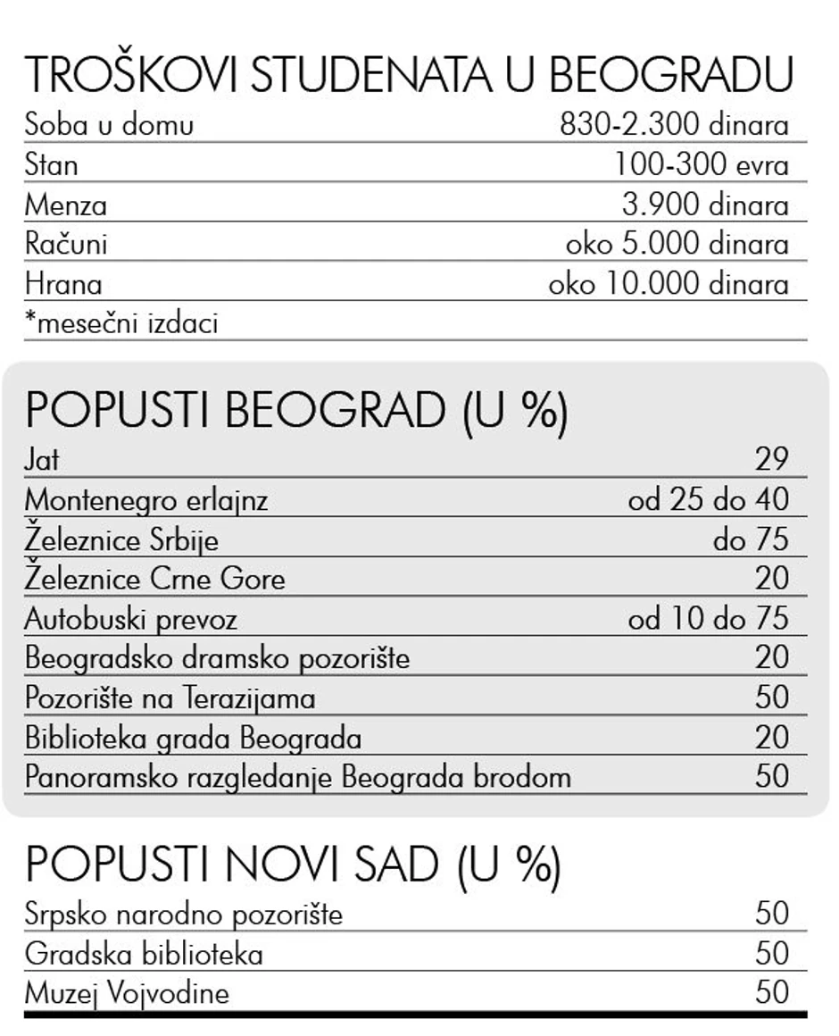 Najveći luksuz su studije u Beogradu, jer su i školarine i cene iznajmljivanja stanova u prestonici najviše. Tako u nanjeftinijoj varijanti za brucoša iz unutrašnjosti roditelj treba da izdvoji za sobu u domu i hranu nešto manje od 5.000 dinara mesečno.
