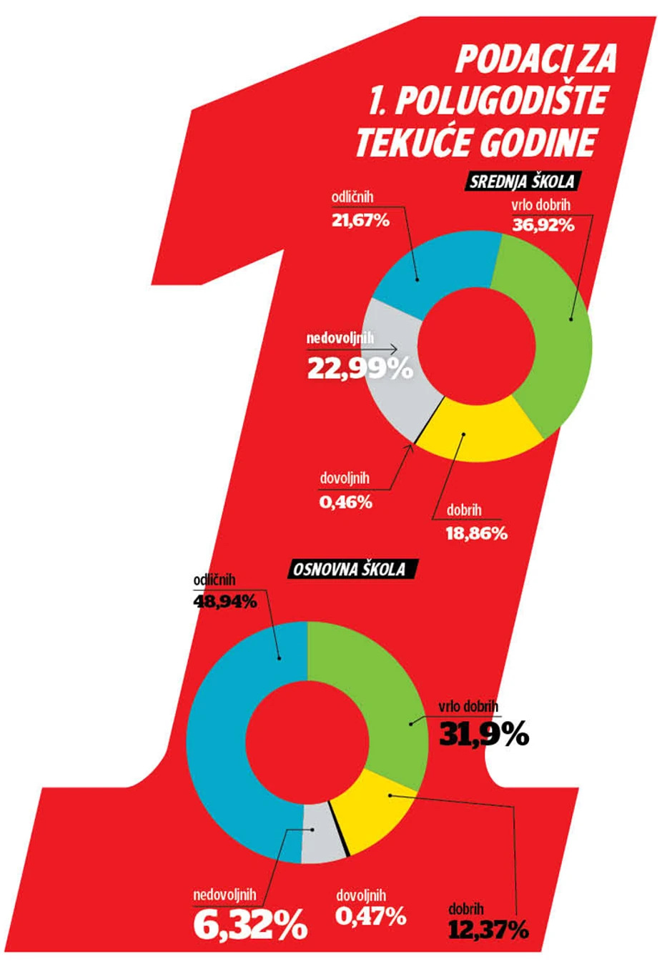 Sa odličnim uspehom na kraju prvog polugodišta prošlo je 21,67 odsto učenika srednjih škola, za razliku od osnovaca gde je skoro polovina odlikaša, 48,94 odsto. Sa nedovoljnim uspehom situacija je alarmantna u srednjim školama, jer čak 22,09 odsto učenika ima najmanje jednu zaključenu jedinicu.
