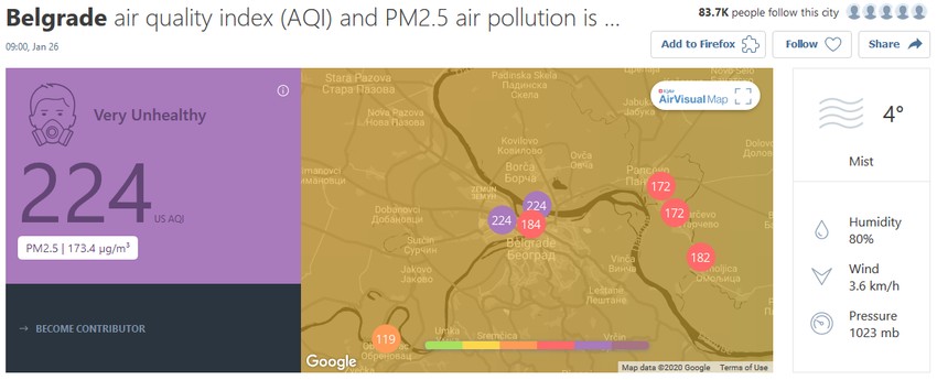 Podsetimo, koliko juče, Beograd se posle nekoliko dana vetra i nešto kvalitetnijeg vazduha opet popeo na neslavno prvo mesto po zagađenosti. Naš glavni grad je merio 253 PM čestica i skoro ceo dan držao tu nezavidnu titulu najzagađenijeg grada.