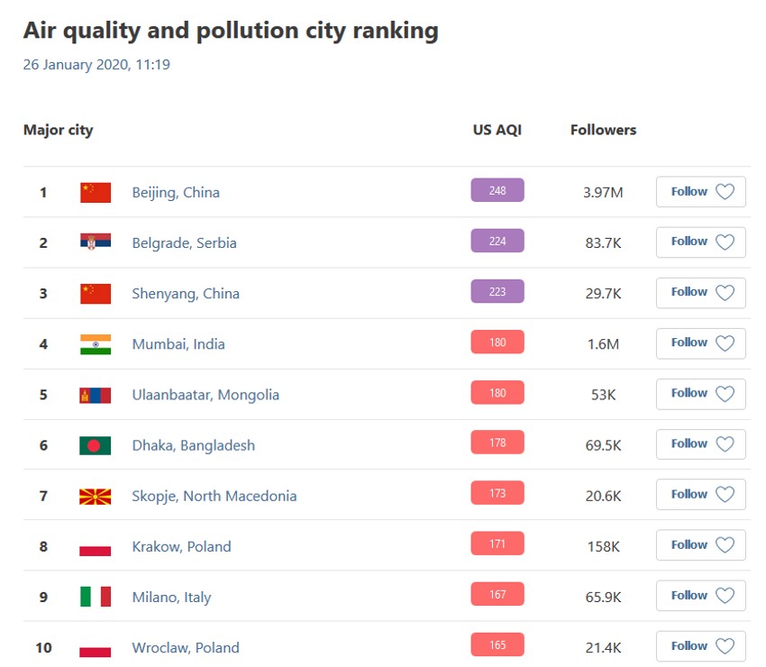 Dakle, Beograd je i danas ljubičast, ali ni drugi gradovi u Srbiji nisu ništa bolji s tim da je Bor danas ubedljivo najkritičniji grad Srbije. No, situacija nije drastično bolja ni u drugim mestima, pa se gotovo svi bore sa velikim stepenom zagađenja.