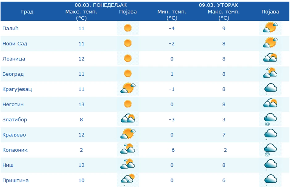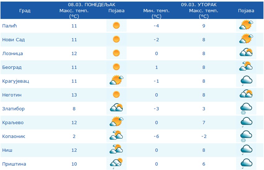 U toku prepodneva očekuje nas naoblačenje, koje će se preko centralnih krajeva do kraja dana širiti ka severu, uslovljavajući mestimično kišu, a u planinskim predelima sneg uz povećanje, odnosno formiranje snežnog pokrivača.