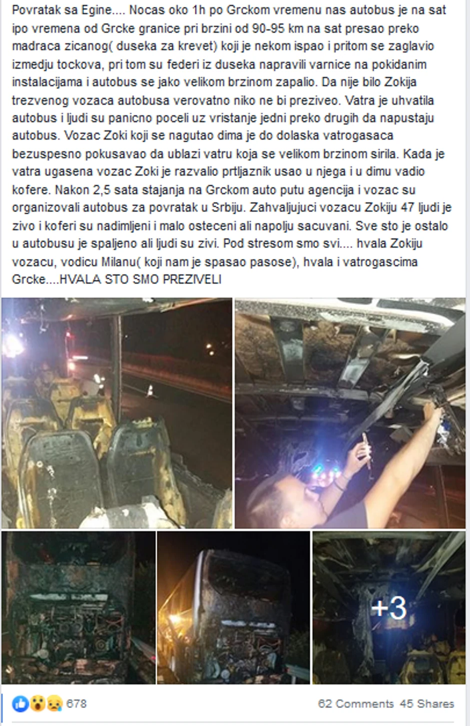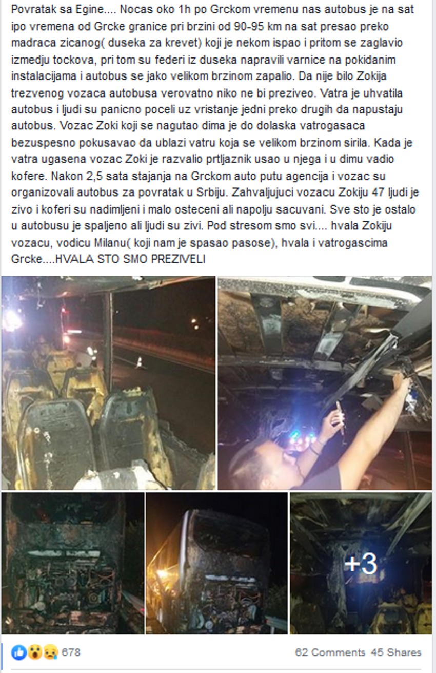 Samo prisebnom reakcijom vozača sprečena je tragedija, a svi putnici iz autobusa su brzo evakuisani. Vozač autobusa, za koga jedna od putnica kaže da je izuzetno hrabar, uspeo je da obuzda vatru koja je ubrzo zahvatila autobus. On je čak uspeo i da spasi kofere svih putnika.