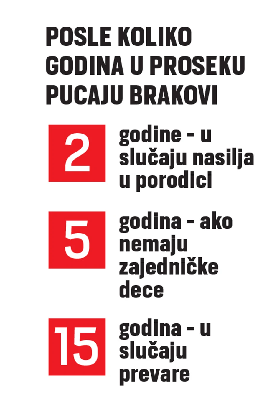 - Na razvod se parovi odlučuju ako nemaju zajedničke dece, to se nekada desi posle tri godine, pet, ili kasnije. Dešavaju se razvodi i zbog porodičnog nasilja, netrpeljivosti, ili ako jedan od partnera ode od kuće zbog neke druge vanbračne veze. U proseku su u braku po pet godina, ako nemaju dece odlučuju se da se sporazumno razvedu, što se tiče nasilja u porodici, brakovi pucaju ili posle godinu do dve dana, ali i posle desetak godina. Što se tiče prevare, do razvoda dolazi uglavnom posle 15 ili 20 godina zajedničkog života kada jedno od partnera napusti porodični dom, objašnjava advokatski pripravnik Mina Krstić.