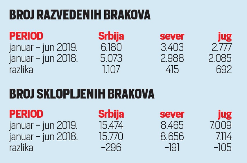 Iako se u Srbiji godišnje više potpiše brakova nego razvoda, to ipak nije dovoljno da bi stanje bilo zadovoljavajuće. Prema najnovijim podacima, u prvoj polovini ove godine sklopljeno je ukupno 15.474 braka, od toga 8.465 na severu i 7.009 na jugu Srbije, što je u poređenju sa istim periodom prošle godine nešto manje, kada je ukupno sklopljeno 15.770 brakova, od toga 8.656 na severu i 7.114 na jugu.