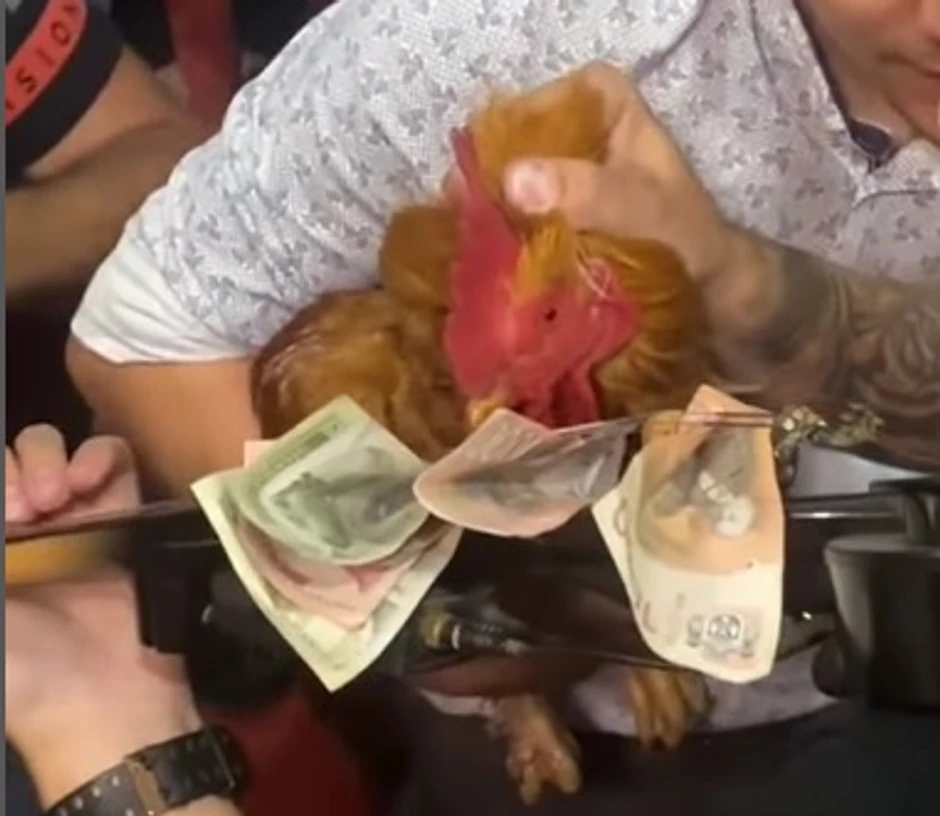 Na snimku se vidi muzičar kako držeći glavu kokoške njenim kljunom "svira" violinu, dok drugi pridržava nemoćnu životinju kako ne bi bežala.
