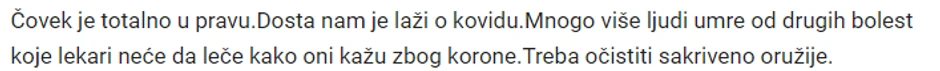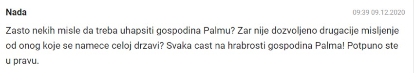 "Potpuno je čovek u pravu", "Svaka mu čast", "To Palma, care", "Sve je lepo rekao", "Svaka mu je k'o u Njegoša", "Kon i Krizni štab na aparatima", "Hvala Palma što postojiš"... samo su mali deo zabrinjavajućih komentara.