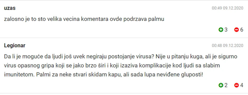 "A zašto Palma ne ode u crvenu zonu neke kovid bolnice pa da nam sa lica mesta pošalje poruke", "Oduzeti mu poslanički mandat", "Da li je moguće da ljudi još uvek negiraju postojanje virusa", "Zbog čega nije ubapšen"... bili su neki od komentara čitalaca "Blica".