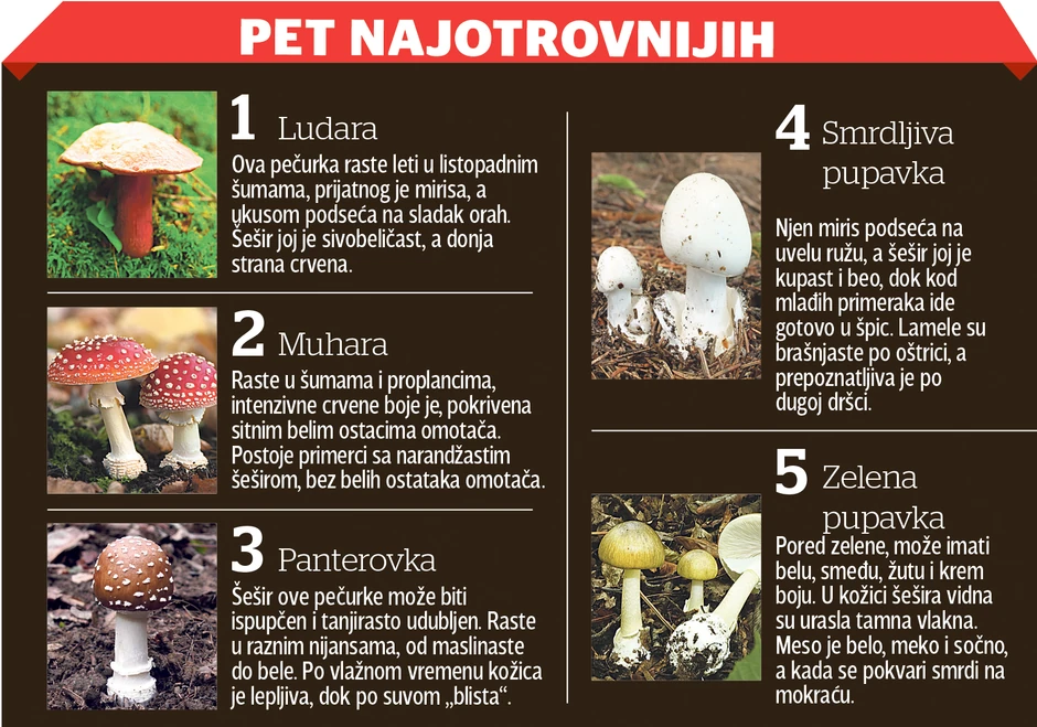 - Pored nekoliko stotina jestivih, nejestivih i lekovitih, postoji nekoliko desetina otrovnih gljiva. Pod pojmom otrovne gljive podrazumevaju se sve one vrste koje u organizmu izazivaju patološke promene i oštećenja organa. Neke od njih izazivaju blage reakcije, kao što su bolovi u trbuhu, mučnina, povraćanje ili alergijske reakcije, ali postoje i vrste koje izazivaju mnogo ozbiljnija oštećenja i smrt - objašnjava prof. dr Slavica Vučinić iz Nacionalnog centra za kontrolu trovanja VMA.