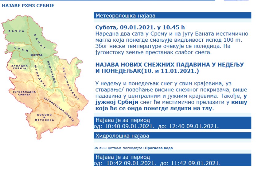 "U nedelju i ponedeljak sneg u svim krajevima, uz stvaranje/ povećanje visine snežnog pokrivača, više padavina u centralnim i južnim krajevima. Takođe, u južnoj Srbiji sneg će mestimično prelaziti u kišu koja će se onda ponegde lediti na tlu", navodi se na sajtu RHMZ-a.