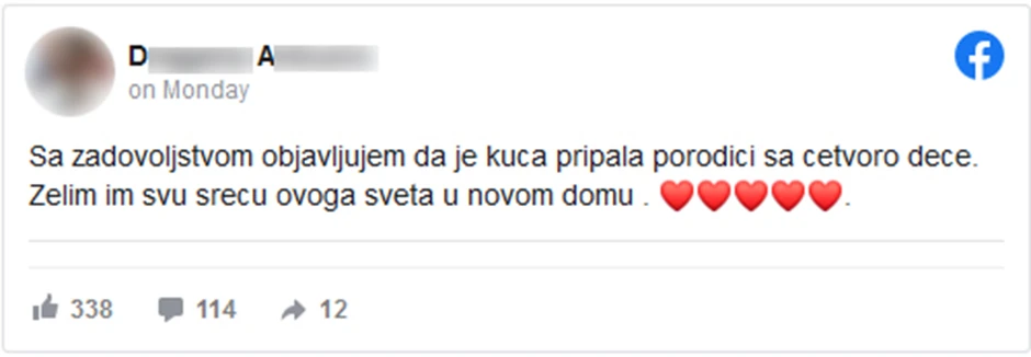 Nakon toga, poziv je objavila na društvenoj mreži i uspela da pronađe porodicu kojoj je dom neophodan.