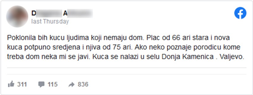 Inače, domaćinstvo je prethodno u par navrata bilo oglašeno na prodaju, ali nije bilo zainteresovanih kupaca, a D.A. je kontaktirala i valjevski Centar za socijalni rad raspitujući se kome može da ga pokloni, ali odgovor nije dobila.