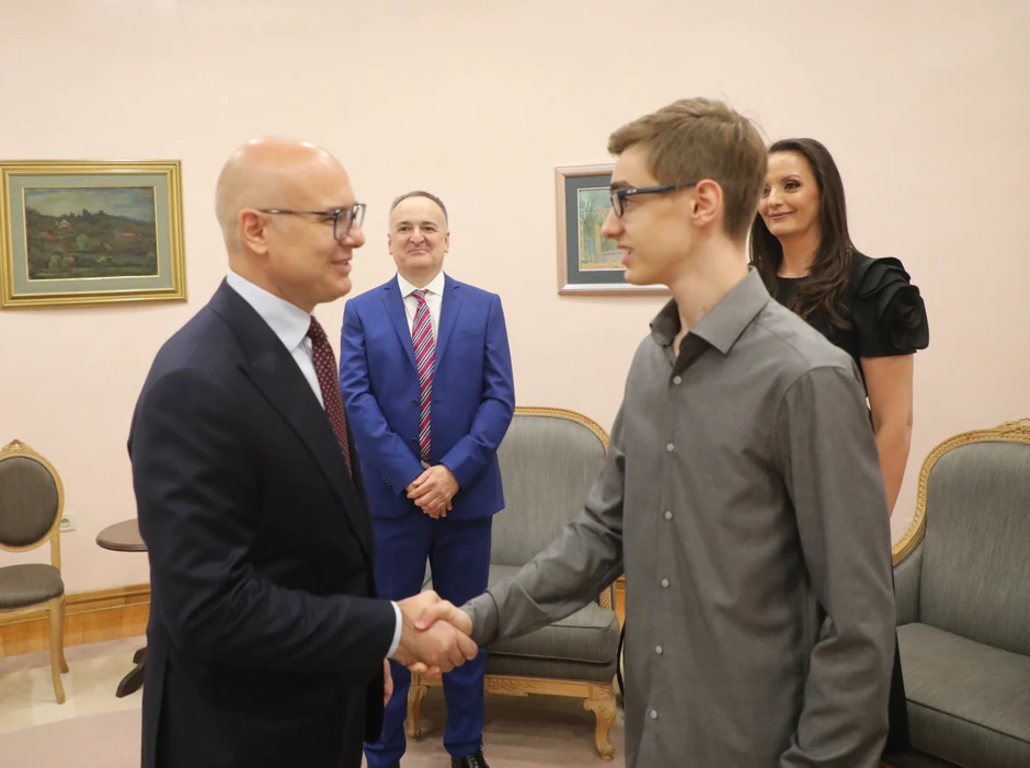 Predsednik Vlade Republike Srbije Miloš Vučević primio je danas učenika Matematičke gimnazije Andreja Drobnjakovića, koji je na nedavno održanoj Međunarodnoj „Stemko“ olimpijadi u Singapuru osvojio pet zlatnih medalja, i poručio da je Srbija ponosna na svoje mlade talente i da će učiniti sve da im obezbedi još bolje uslove za učenje, rad i rezultate na domaćim i svetskim takmičenjima.