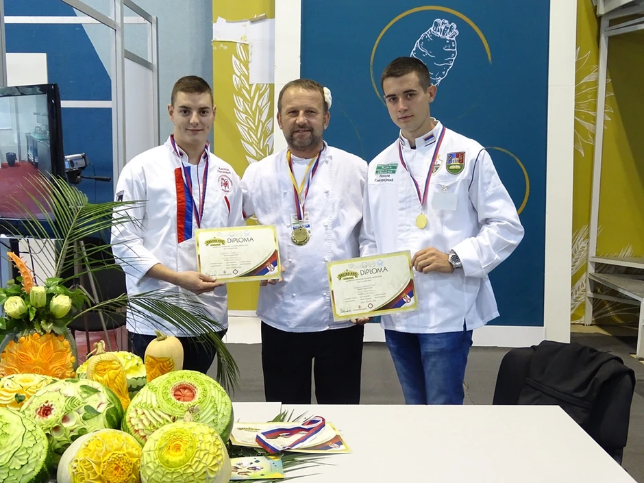 U disciplini "karving uživo", rezbarenje voća i povrća na zadatu temu, naši studenti su od istaknutih međunarodnih sudija dobili maksimalan broj poena i osvojili zlatnu i srebrnu medalju.