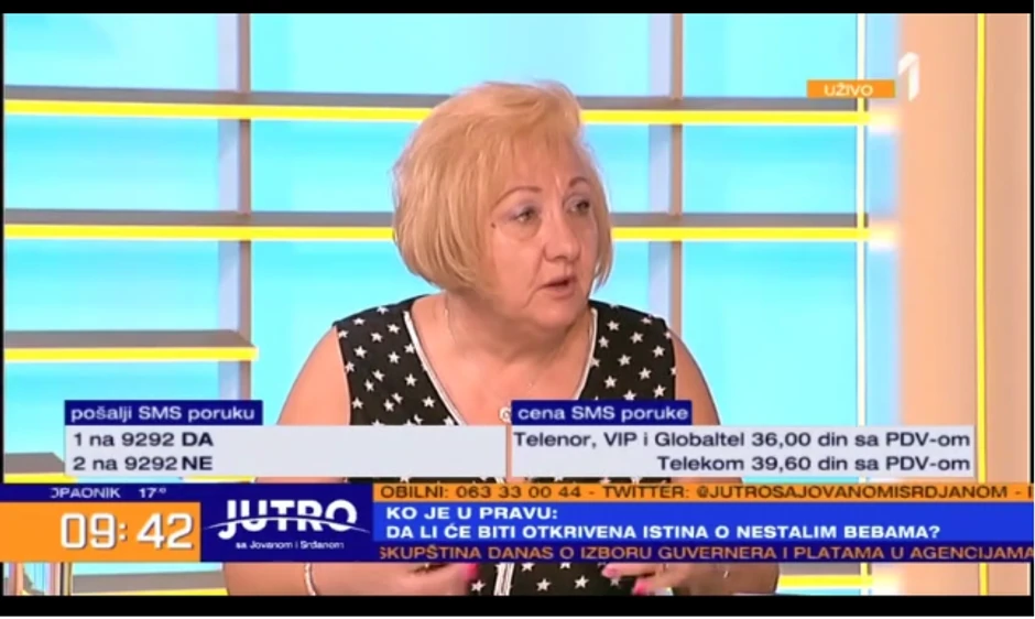 - U jednom od njih dobijem da se dete rodilo živo, da je proplakalo i prodisalo u 4.20. Prvi dokument koji odlazi u matičnu službu jeste da se dete rodilo u 4.20 i umire u 5 sati. Druga prijava deteta, se dešava 1 aprila u 4 sata. Te dve prijave su različite. U jednom stoji i moj falsifikovan potpis. To sam videla. Tu se sudim, jer sud hoće da dokaže da je to moj potpis - kaže Ljiljana.
