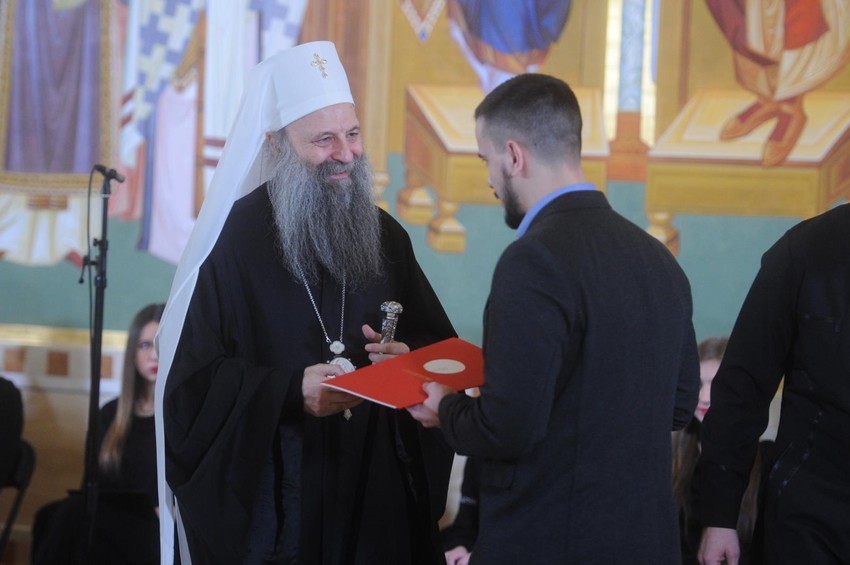 Patrijarh srpski Porfirije uručio je večeras stipendije Srpske pravoslavne crkve najboljim studentima završnih godina fakulteta koji su osnivači Univerziteta u Beogradu - Pravnog, Filozofskog, Elektrotehničkog, Medicinskog i Pravoslavno bogoslovskog fakulteta.