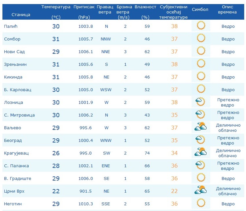 U gradovima širom Srbije temperatura se prema podacima Republičkog hidrometeorološkog zavoda (RHMZ) od 12.00 časova, kreće između 29 i 31 stepena, ali je subjektivan osećaj kao da je mnogo toplije.