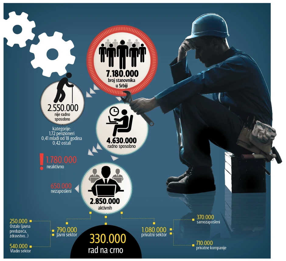 Zaključak Svetske banke je da je takvo stanje neodrživo, jer privatni sektor zapravo izdržava mnogo više ljudi. Naime, prema podacima te institucije, od 7,1 milion stanovnika u Srbiji, radno sposobno je 4,6 miliona njih. Od toga, međutim, nešto radi 2,85 miliona građana dok se svi ostali, a to je oko 1,8 miliona ljudi vode kao nezaposleni iako su radno sposobni.
