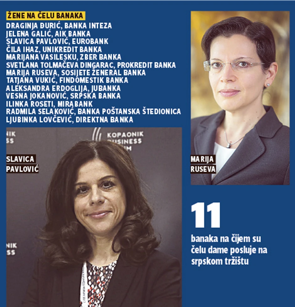 U retko kojoj profesiji u svakoj trećoj firmi iz jedne oblasti žene zauzimaju ključne rukovodeće funkcije. Upravo to je slučaj sa bankarstvom, jer su žene predsednice izvršnih odbora u 11 od ukupno 31 banke. S obzirom na to da u još dve banke žene vode upravne odbore, onda je taj procenat i veći.