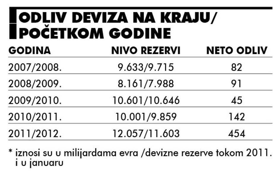 U januaru je kroz banke iz zemlje izašlo 518 miliona evra. Kako je bilo i priliva iz inostranstva, devizne rezerve olakšale su za mesec dana ukupno 454 miliona evra. To je ubedljivo najviši odliv deviza u poslednjih pet godina, pet i po puta viši nego 2008. i čak trostruko viši nego lane.