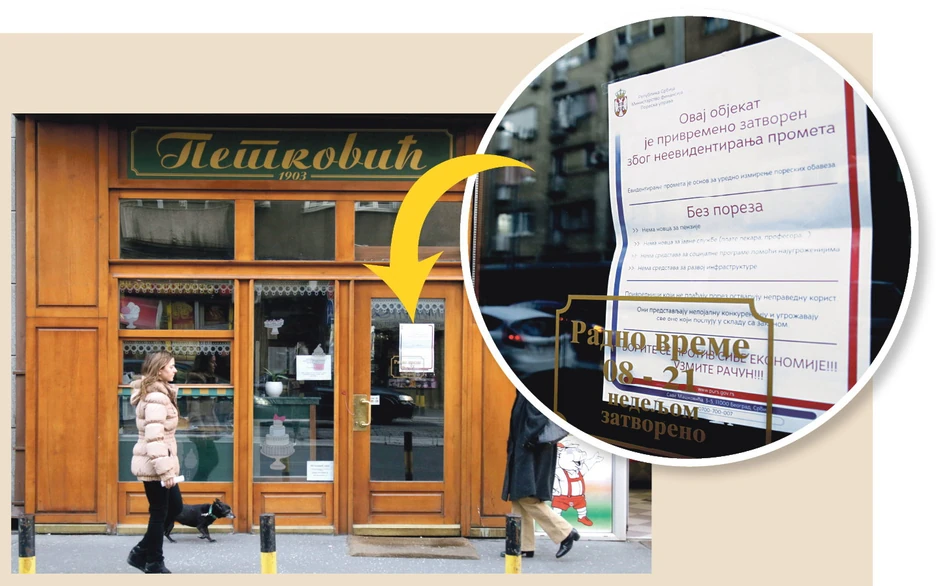 Zbog neizdavanja fiskalnih računa Poreska uprava je zatvorila njegovu poslastičarnicu u centru Beograda. Uz katanac na vratima stoji rešenje poreznika na kome piše “Objekat privremeno zatvoren zbog neevidentiranja prometa”.