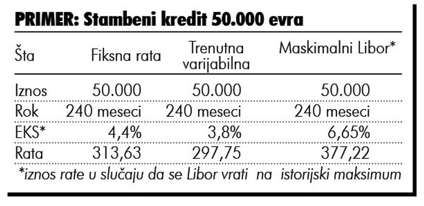Konkretno, u slučaju da libor nastavi da raste, a istorijski pokazatelji govore da je njegova maksimalna vednost u poslednjih pet godina bila i do skoro tri odsto, korisniku koji bi prihvatio predlog banke ukupna kamata bi porasla za 3,65 odsto plus tri odsto. Ukupno 6,65 odsto.