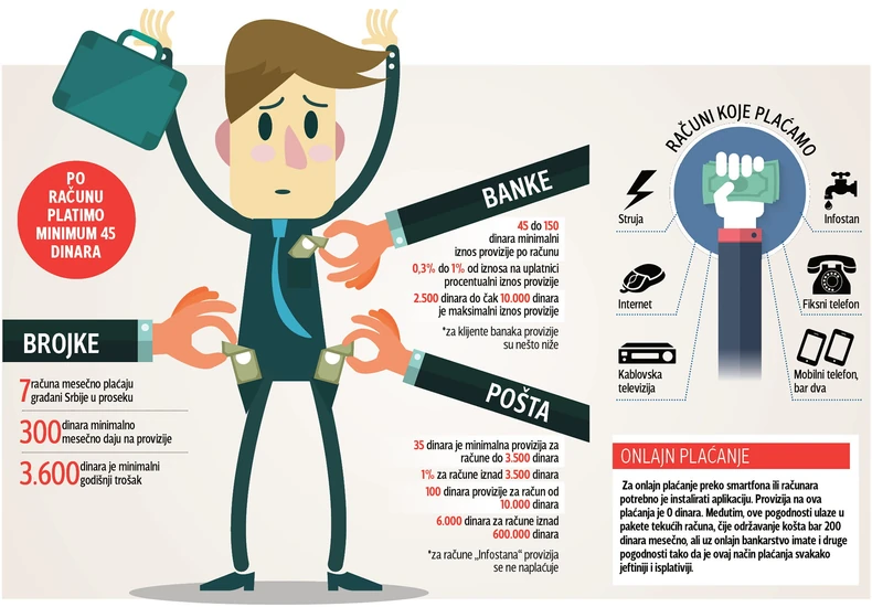 U zavisnosti od toga u koju banku uđete, plaćanje jednog računa koštaće vas od 45 do 150 dinara. To znači da ćete za sedam računa, koliko minimum svakog meseca plaća jedno domaćinstvo, u pogrešnoj banci platiti čak 1.050 dinara na ime provizija. Ako biste preko ove banke nastavili da izmirujete svoje obaveze prema javnim komunalnim preduzećima, to bi vas za godinu dana stajalo više od 12.600 dinara.