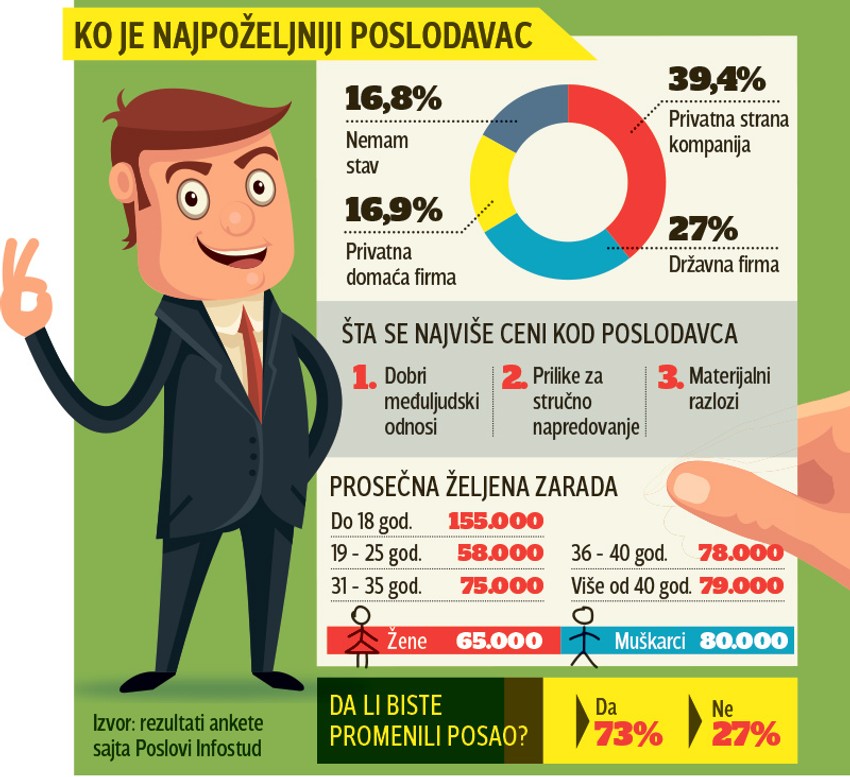 Od 10.000 učesnika u anketi, čak 40 odsto je navelo da bi najradije radilo u stranoj firmi, dok je nameštenje u državnoj službi želja svakog četvrtog. Nešto manje atraktivne za zaposlenje su domaće privatne firme za koje je zainteresovano oko 17 odsto ispitanika.