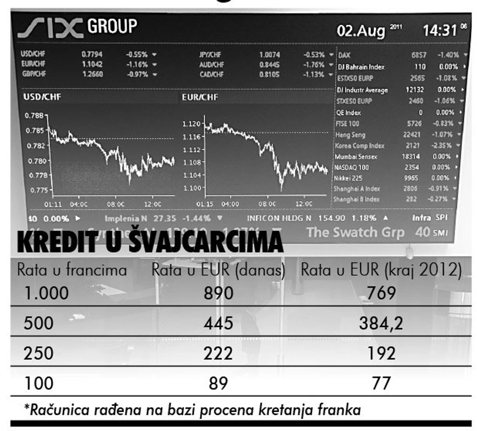 Građani koji danas plaćaju ratu za stan 250 franaka ili 222 evra, krajem sledeće godine mogli bi da imaju 40 evra manje mesečno opterećenje. Ekonomisti i značajne finansijske institucije procenjuju da bi evro krajem 2012. godine mogao da vredi između 1,25 i 1,30 franaka, naspram današnjih 1,1.