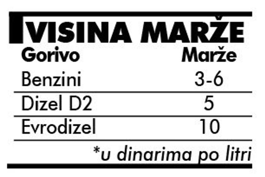 Tomislav Mićović, generalni sekretar Udruženja naftnih kompanija Srbije (UNKS), čije su članice OMV, MOL, Helenik, Petrobart AVIA, INA, kaže da iskustvo govori da je zdrva konkurencija najbolji način zaštite potrošača. U Udruženju privatnih benzinskih stanica kažu da su marže kod benzina od tri do pet-šest dinara, kod dizela D2 oko pet dinara, a evrodizela i do 10 dinara.