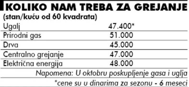 Najmanje troškove za grejanje tokom zimske sezone imaće domaćinstva koja se greju na ugalj i drva koja će za šest meseci morati da izdvoje od 45.000 do 47.000 dinara, dok se najmanje isplati grejati se na prirodni gas, koji će jedno domaćinstvo za sezonu koštati 51.000 dinara.
