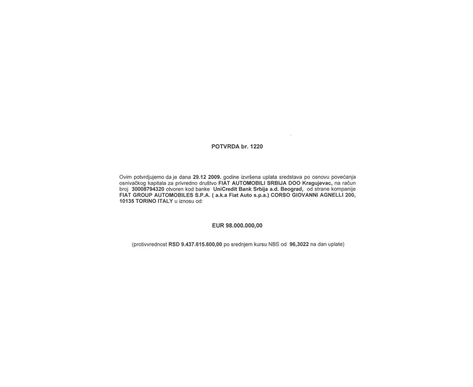Italijanski „Fijat“ uplatio je 98 miliona evra na račun preduzeća „Fijat automobili Srbija“ kao prvi novčani ulog. Na taj način „Fijat“ postaje većinski vlasnik zajedničkog preduzeća sa 67 odsto kapitala, dok Srbiji pripada 33 odsto.