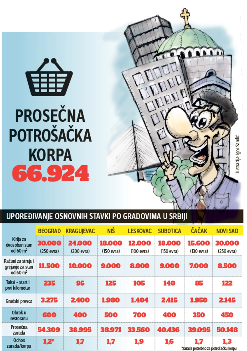 S druge strane, ona stara: „što južnije, to tužnije“ više ne važi jer je poslednjih godina tužno skoro sve izvan granica prestonice. To možda najbolje ilustruje odnos potrošačke korpe i prosečnih zarada. Doduše, određene cene, pre svega za komunalne usluge, u Beogradu su znatno više.