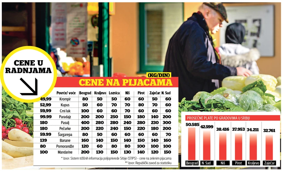 Oni sa prosečnom platom od oko 50.000 dinara mogu da kupe korpu koju smo analizirali 22 puta na pijaci, a u supermarketu čak 33. Od sedam gradova u kojima smo poredili cene povrća, najjeftinija pijaca je u Nišu. S druge strane Loznica, koja ima najmanju prosečnu platu u odnosu na ostale gradove, po skupoći je odmah iza Beograda.