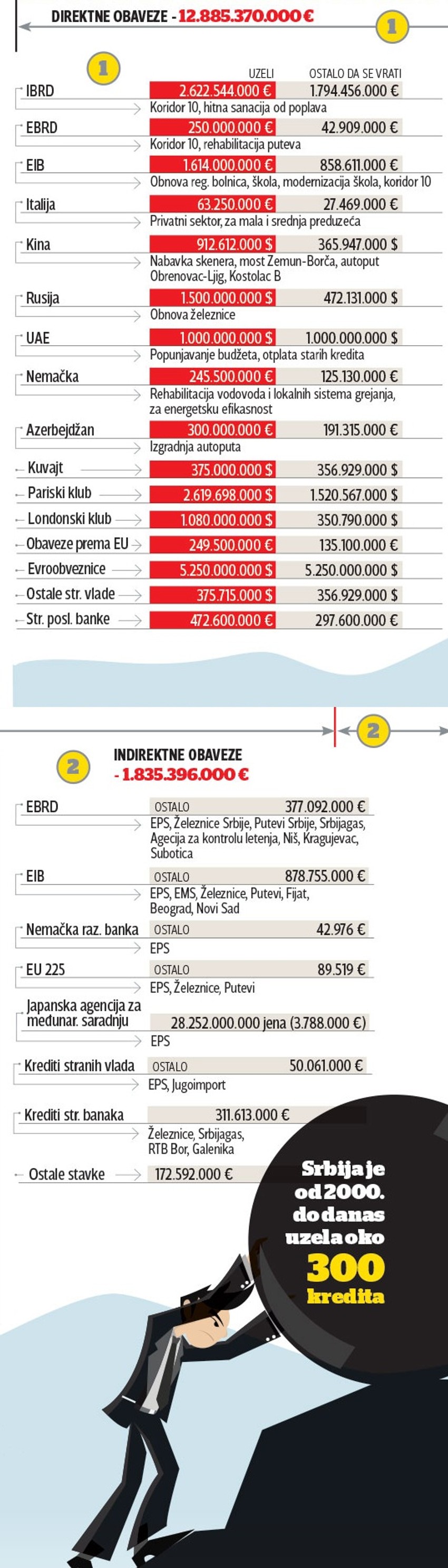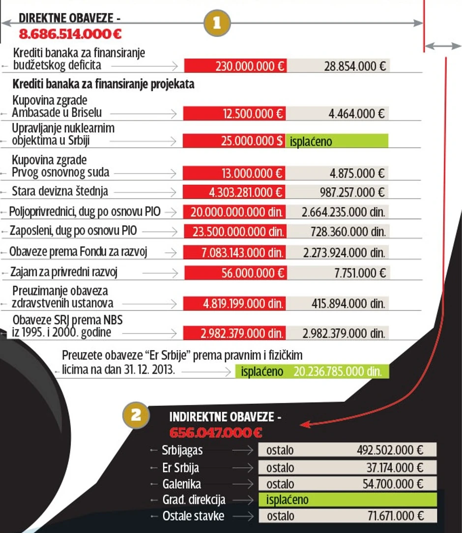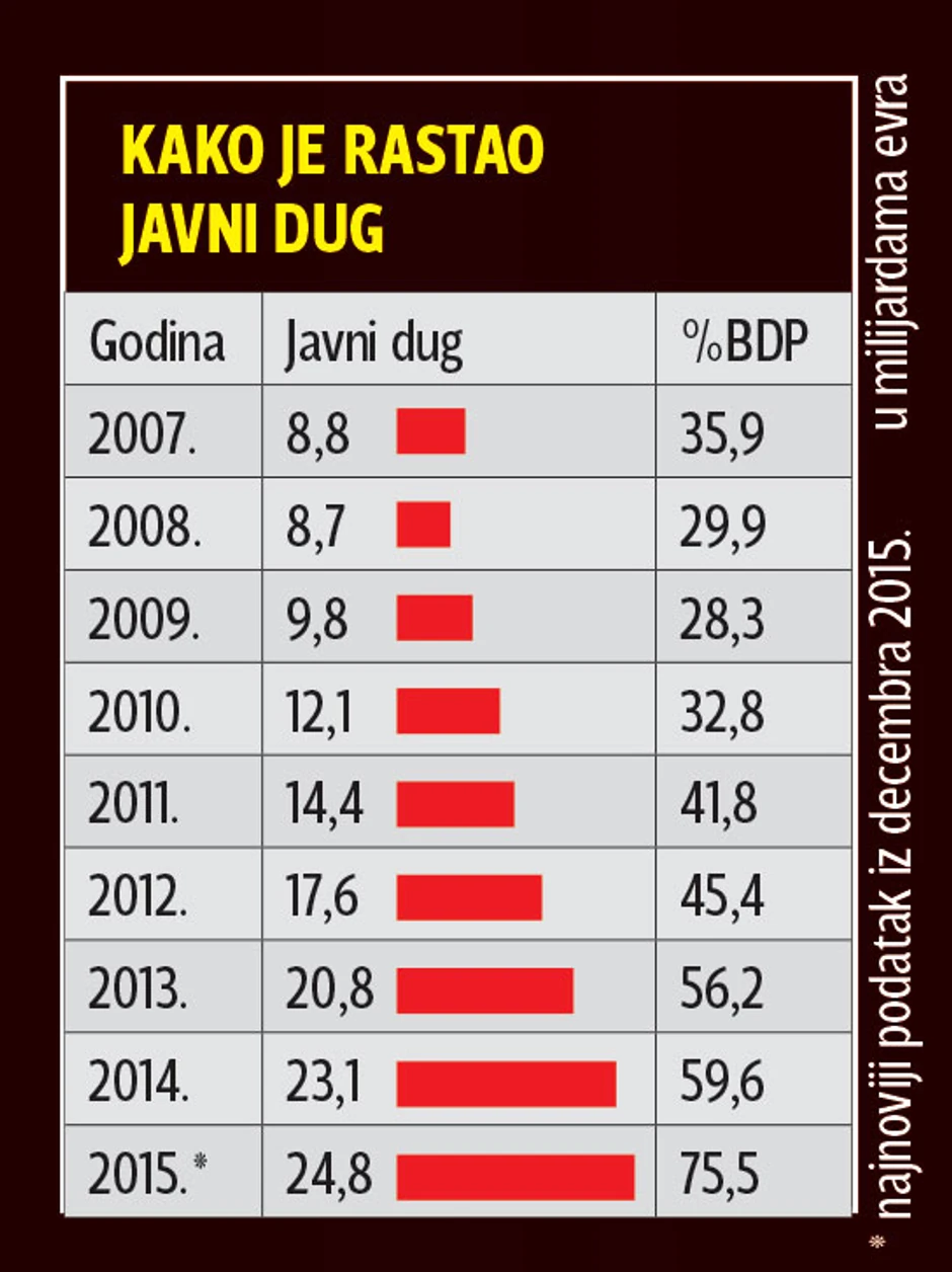 Pre samo osam godina javni dug Srbije iznosio je 8,78 milijardi evra. Te godine smo na kamate dali oko 117 miliona, a prošle godine čak milijardu evra. Sa oko dve milijarde evra novih zaduživanja svake godine, Srbija je stigla do 24,8 milijardi evra duga, odnosno 75,5 odsto BDP.