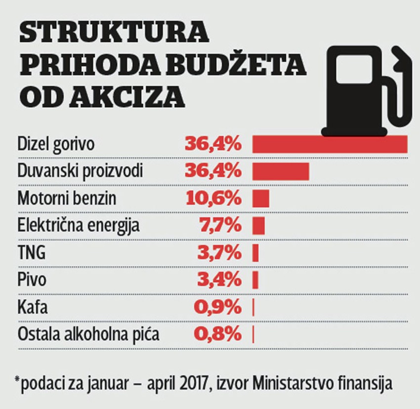 Akcize su na trećem mestu po visini svih prihoda budžeta u ovom periodu, a daleko najveći priliv u državnu kasu je od dizela i cigareta. Tako akcize samo na ova dva proizvoda zajedno čine čak 72,8 odsto prihoda ove vrste nameta. Na trećem mestu je motorni benzin sa 10,6 odsto učešća u akcizama, a zatim električna energija sa 7,7 odsto, na koju je akciza uvedena pre samo dve godine.