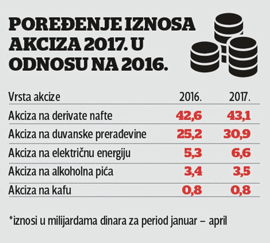Kada se uporede prva četiri meseca 2017. sa prvim kvartalom prošle godine, priliv u državnu kasu od svih akciza je porastao. Najveći skok je od akciza na duvanske prerađevine, koje su od 25,2 milijarde dinara prošle godine dostigle 30,9 milijardi u 2017.