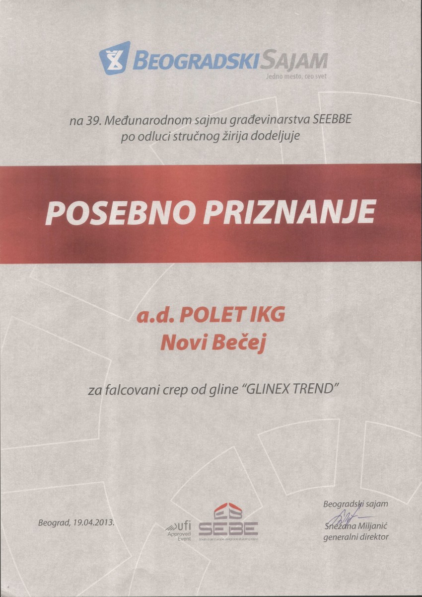 Uz jedinstvenu akcija (O)siguran dom uz Nexe krov Polet svojim načinom poslovanja i proizvodnje, osim o sigurnosti brine i o ekologiji. U Poletu je počela i proizvodnja engobiranog odnosno bojenog crepa, a na ovogodišnjem sajmu gradjevinarstva u Beogradu Polet je dobitnik specijalnog priznanja za svoj novi proizvod engobirani crep od gline Glinex Trend.