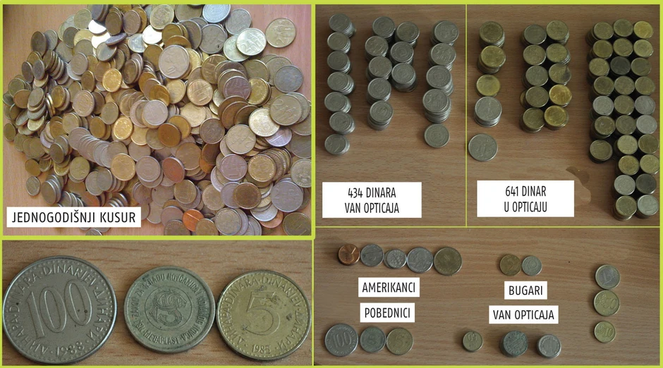 Ova devojka je pre nekoliko dana shvatila da ima 641 dinar važećih novčića, 434 dinara kovanica na kojima piše „Jugoslavija” a koje su odnedavno povučene iz opticaja. Na gomili se našlo i nekoliko evrocenti, dolar, bugarski lev, a čak i nekoliko makedonskih denara.