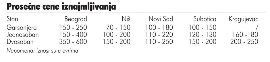 Stanovi za iznajmljivanje u Srbiji nikad jeftiniji. Za prazan stan od 100 kvadrata u centru Beograda sada treba odvojiti oko 500 evra, a za nameštenu garsonjeru oko 150. U odnosu na prošlu godinu u prestonici su kirije za 30 odsto niže, u Kragujevcu za 10, a u Novom Sadu za čak 40 odsto. U agencijama za promet nekretnina kažu da je do takvog trenda dovela velika ponuda nasuprot maloj tražnji.