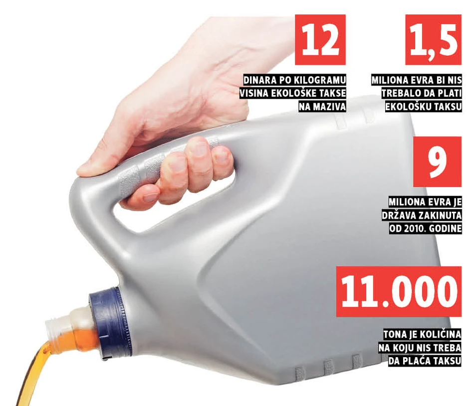 Plaćanje ekološke takse za sve proizvođače maziva obavezno je od 2010. godine, ali Naftna industrija Srbije do sada nije uplatila ni dinar po tom osnovu. Država godišnje gubi oko milion i po evra, saznaje "Blic".