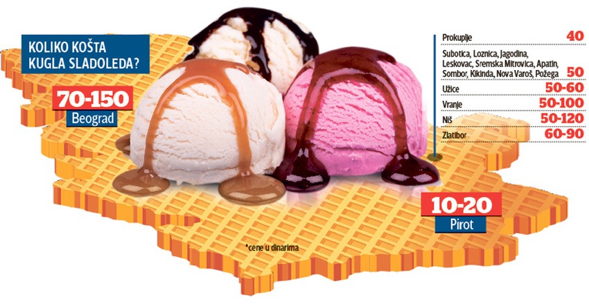Kugla sladoleda u Pirotu košta deset dinara, a u Beogradu i do 15 puta više. Glavni razlog je različita kupovna moć, ali i cena lokala, kvalitet, dekoracija...