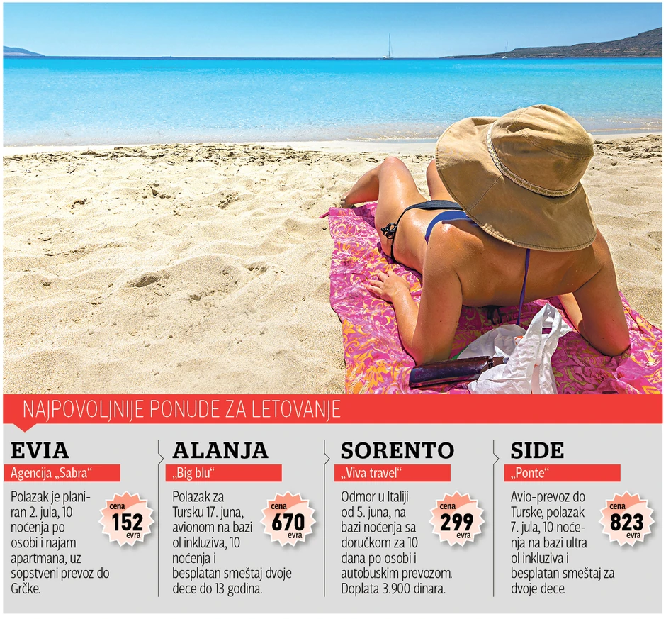 - Dajemo popust od 45 odsto za pojedine hotele u Turskoj do kraja februara. Najtraženiji su ol inkluziv hoteli, jer se tamo dobija komplet usluga, a za decu je obezbeđen poseban meni, igraonice, animatori i slično. Kad se uplati aranžman, cela porodica može slobodno da zaboravi novčanik kod kuće jer je sve besplatno - kaže Dušan Anastasov iz “Big blua”.