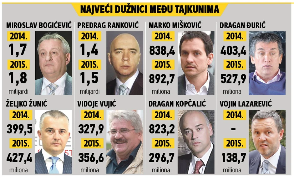 Inače, po jučerašnjim podacima Poreske uprave, uz već tradicionalno najvećeg poreskog dužnika među privrednicima Miroslava Bogićevića, dug značajno raste i „Monusu“ Predraga Rankovića Peconija, koji sada duguje 1,5 milijardi dinara. S „Monusom“ je potpisan ugovor o reprogramu.