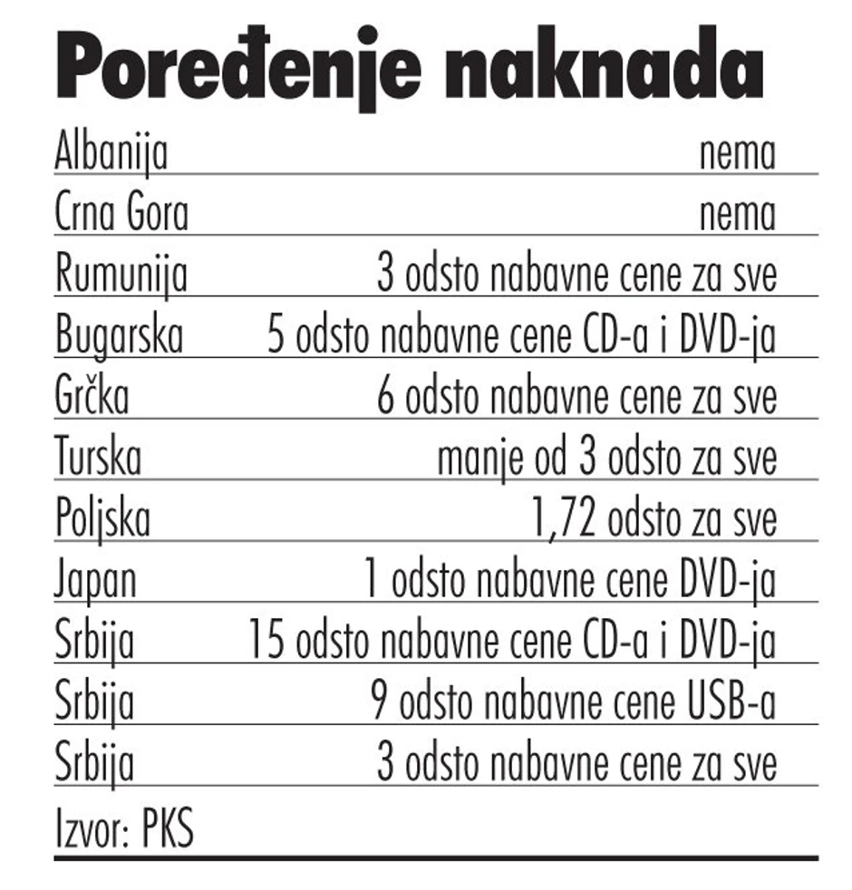 - Ali kada se uzme nabavna cena CD-a od 6-7 dinara i DVD-ja 9-14 dinara, naknada će biti oko 15 odsto. Carina na IT robu je smanjena na jedan odsto, PDV sa 18 na osam procenata, a sada imamo ovako visoke naknade, koje će sigurno ugroziti poslovanje mnogih firmi - ističe Jovanović.