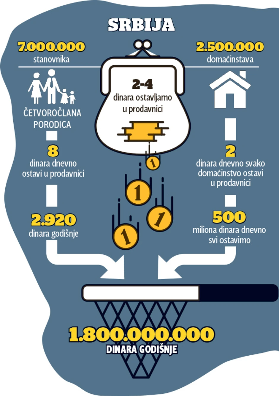 U tom trenutku sitniš deluje smešno, ali ne razmišljate da, ako četiri člana jedne porodice bar jednom dnevno ostave u prodavnici bar po dva dinara, na kraju godine gube 3.000 dinara. Ako svako od 2,5 miliona domaćinstava dnevno ostavi dva dinara u prodavnicama, dolazimo do podatka da Srbi svakog dana bace pet miliona dinara, što na godišnjem nivou iznosi 1,8 milijardi. S druge strane, retka je situacija da trgovci odmahnu rukom i kažu „ma, u redu je“ u slučaju da kupcu zafali sitniš.