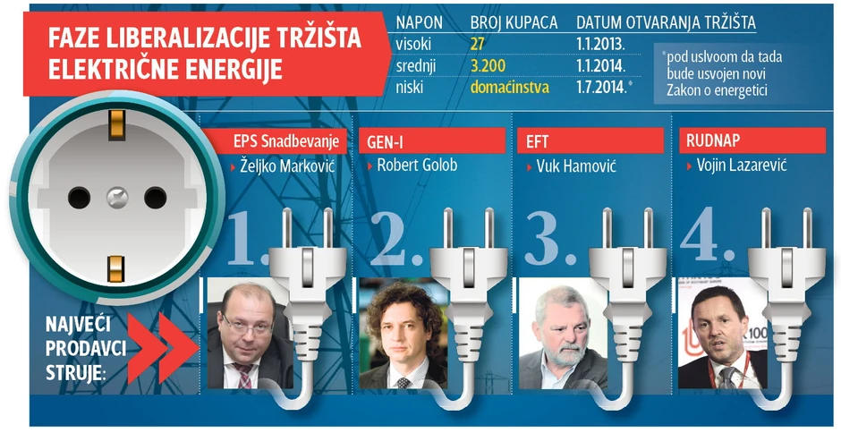 Na listi mogućih prodavaca trenutno ima dvadesetak aktivnih trgovaca strujom. U pitanju su oni koji, delom, danas snabdevaju firme u Srbiji. Da podsetimo, firme koje su priključene na visok napon prodavca struje biraju od početka 2013. godine, a oni na srednjem naponu od 1. januara ove godine.