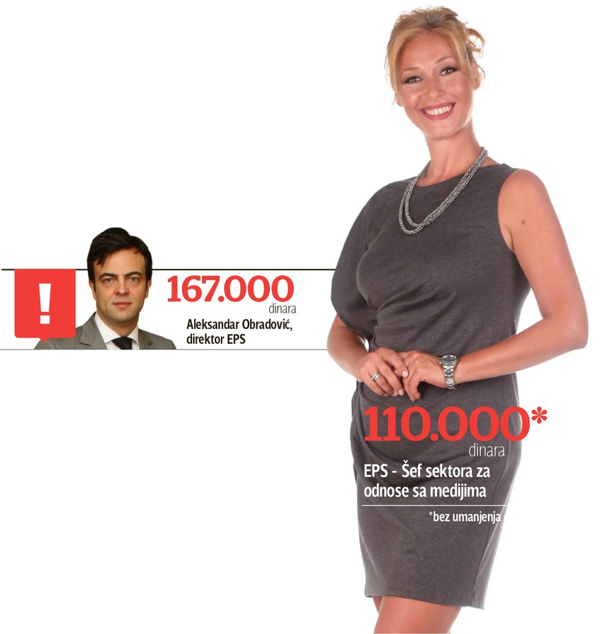 To znači da će nova šefica PR službe EPS-a imati veću platu od premijera Aleksandra Vučića i biti u istom rangu po zaradi s predsednikom države Tomislavom Nikolićem. Koliku platu je tačno bivša voditeljka i urednica TV Prve ispregovarala u EPS-u nam juče nisu rekli. Da nije reč o maloj svoti može se naslutiti i iz toga što je zbog ponude EPS-a odbila gotovo dogovoren angažman na jednoj od televizija.