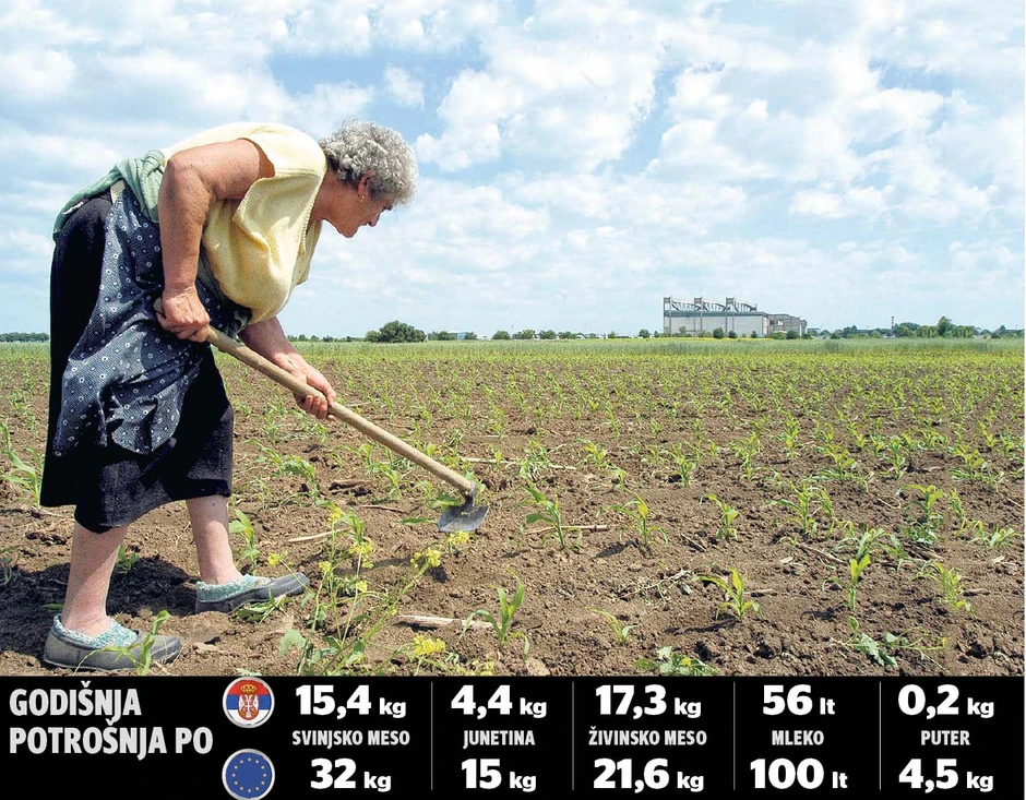 - U Srbiji se godišnje po jednom stanovniku troši 15,4 kilograma svinjskog mesa, a u EU 32 kilograma. Potrošnja junetine kod nas je 4,4 kilograma, a u Uniji 15 kilograma godišnje. Nešto bolje stojimo sa živinskim mesom, koga prosečan stanovnik pojede 17,3 kilograma godišnje, dok je u EU taj broj samo četiri kilograma veći - 21,6 - precizira Gulan.
